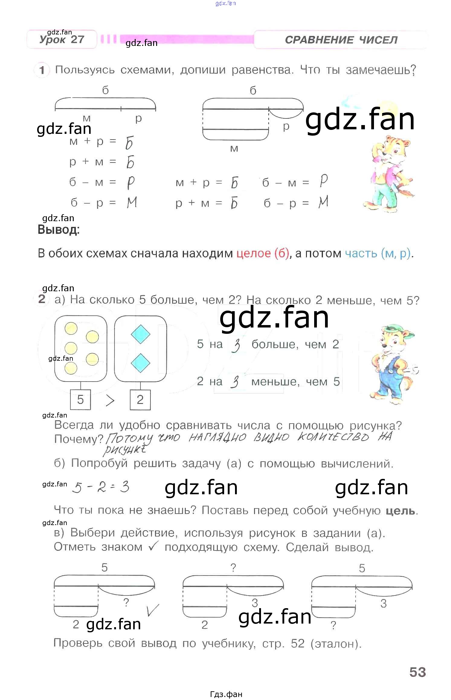 Проверка домашнего задания всегда занимает большое количество времени. На помощь приходит ГДЗ фан по Математике первого класса. Здесь собраны популярные ответы на 53 (Сравнение чисел. Урок 27 № 1, 2) Математика 1 класс рабочая тетрадь Петерсон Л.Г.