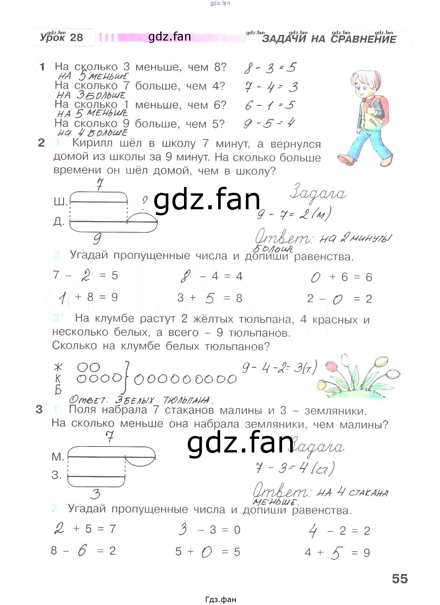 Проверка домашнего задания всегда занимает большое количество времени. На помощь приходит ГДЗ фан по Математике первого класса. Здесь собраны популярные ответы на 55 (Задачи на сравнение. Урок 28 № 1, 2, 3) Математика 1 класс рабочая тетрадь Петерсон Л.Г.