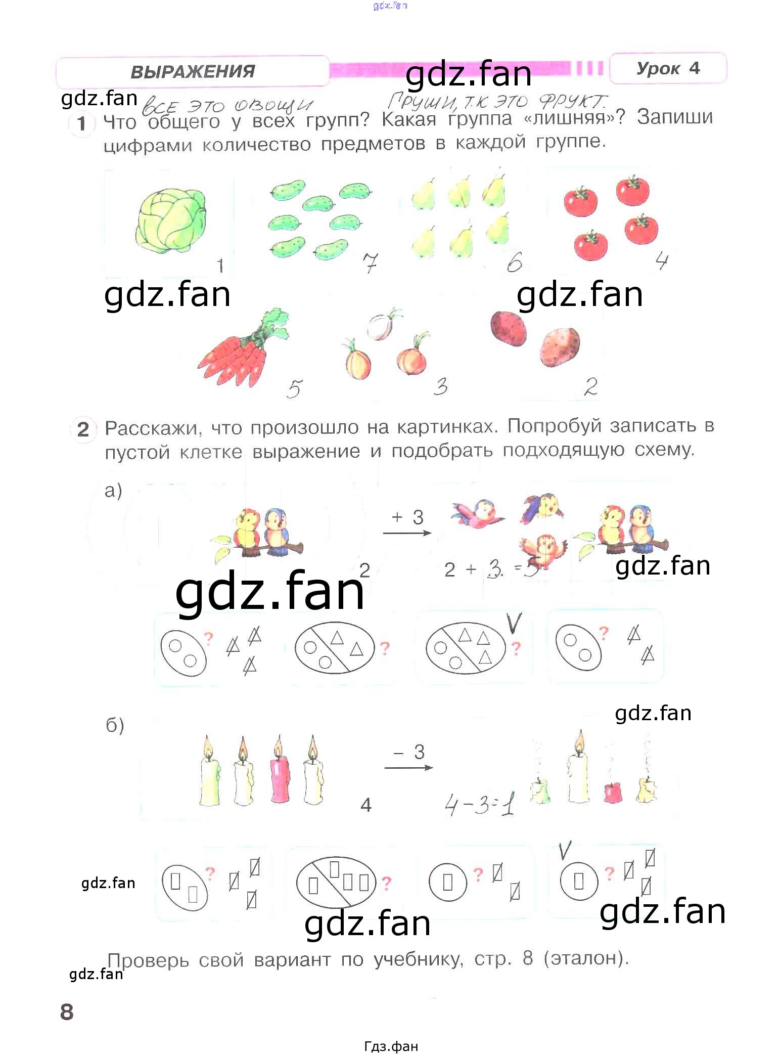 Проверка домашнего задания всегда занимает большое количество времени. На помощь приходит ГДЗ фан по Математике первого класса. Здесь собраны популярные ответы на 8 (Выражения. Урок 4 № 1, 2) Математика 1 класс рабочая тетрадь Петерсон Л.Г.