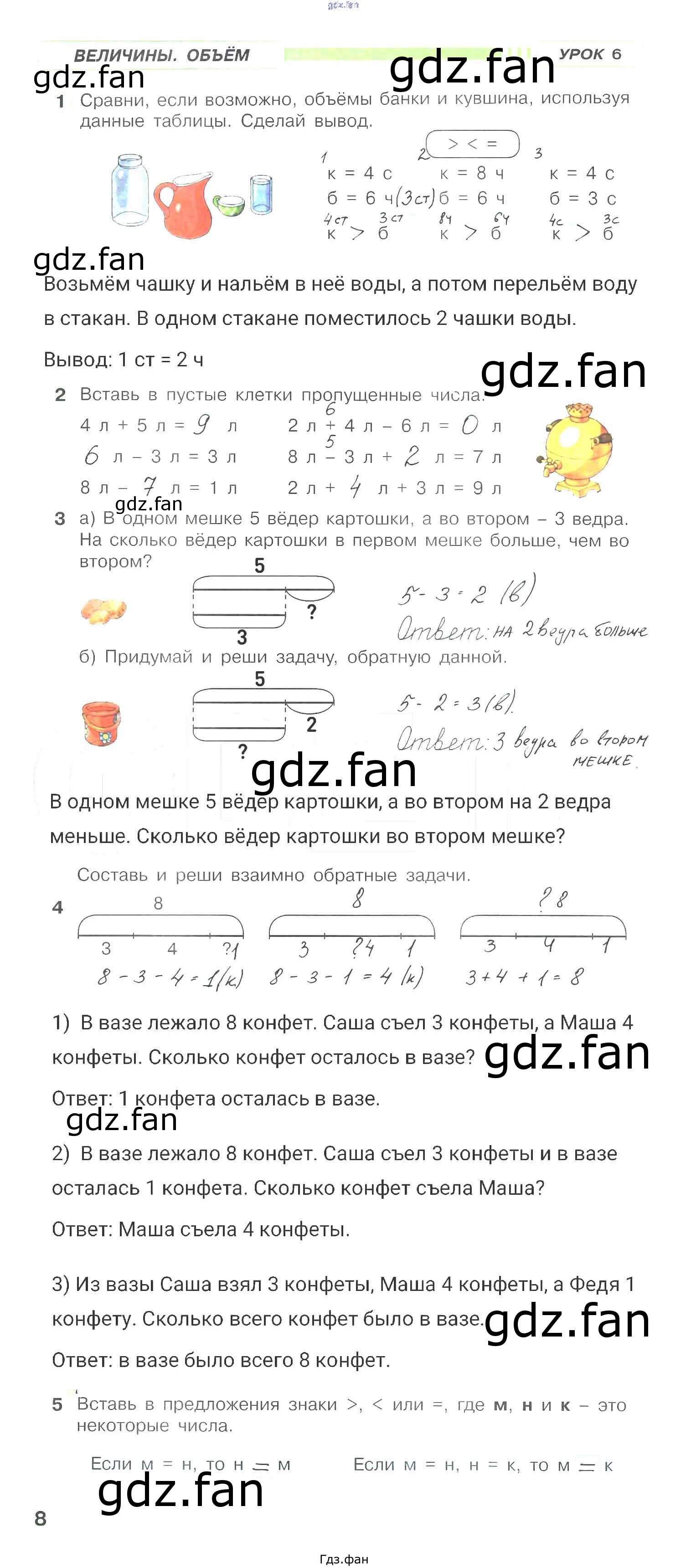 Проверка домашнего задания всегда занимает большое количество времени. На помощь приходит ГДЗ фан по Математике первого класса. Здесь собраны популярные ответы на 8 (Объём. Урок 6 № 1, 2, 3, 4, 5) Математика 1 класс рабочая тетрадь Петерсон Л.Г.