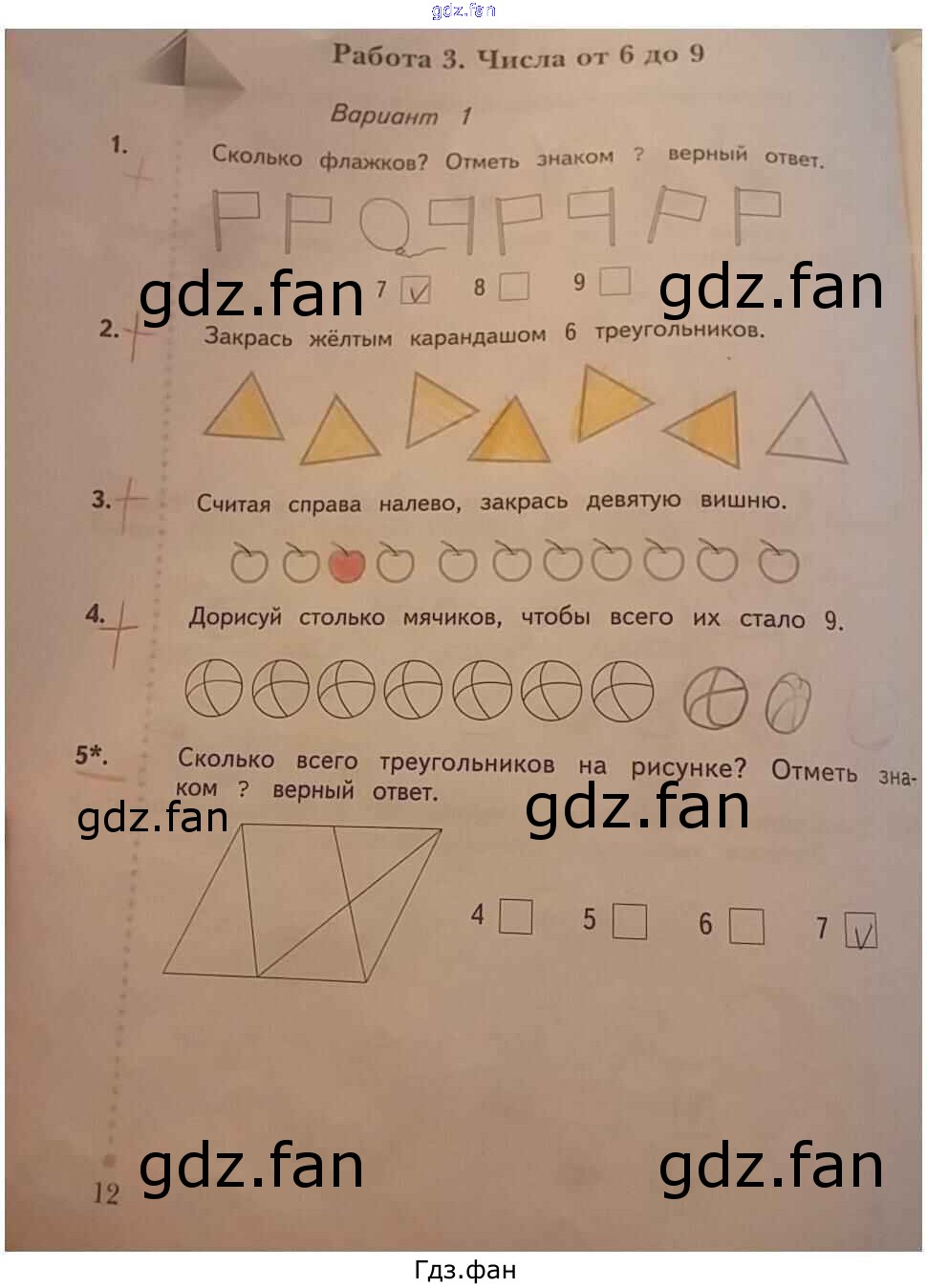 Проверка домашнего задания всегда занимает большое количество времени. На помощь приходит ГДЗ фан по Математике первого класса. Здесь собраны популярные ответы на 12 (Работа 3. Числа от 6 до 9. Вариант 1 № 1, 2, 3, 4, 5) Математика 1 класс тетрадь для проверочных работ Рудницкая В.Н.