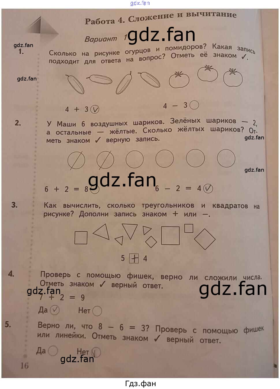 Проверка домашнего задания всегда занимает большое количество времени. На помощь приходит ГДЗ фан по Математике первого класса. Здесь собраны популярные ответы на 16 (Работа 4. Сложение и вычитание. Вариант 1 № 1, 2, 3, 4, 5) Математика 1 класс тетрадь для проверочных работ Рудницкая В.Н.