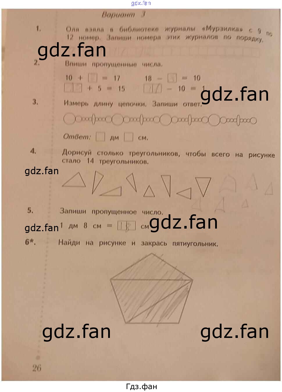 Проверка домашнего задания всегда занимает большое количество времени. На помощь приходит ГДЗ фан по Математике первого класса. Здесь собраны популярные ответы на 26 (Вариант 3 № 1, 2, 3, 4, 5, 6) Математика 1 класс тетрадь для проверочных работ Рудницкая В.Н.