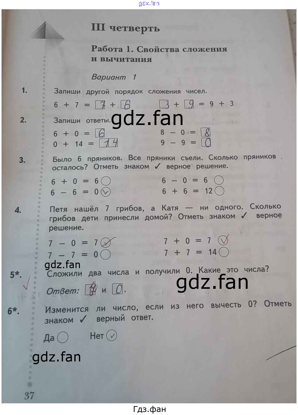 Проверка домашнего задания всегда занимает большое количество времени. На помощь приходит ГДЗ фан по Математике первого класса. Здесь собраны популярные ответы на 37 (Четверть 3. Работа 1. Свойства сложения и вычитания. Вариант 1 № 1, 2, 3, 4, 5, 6) Математика 1 класс тетрадь для проверочных работ Рудницкая В.Н.