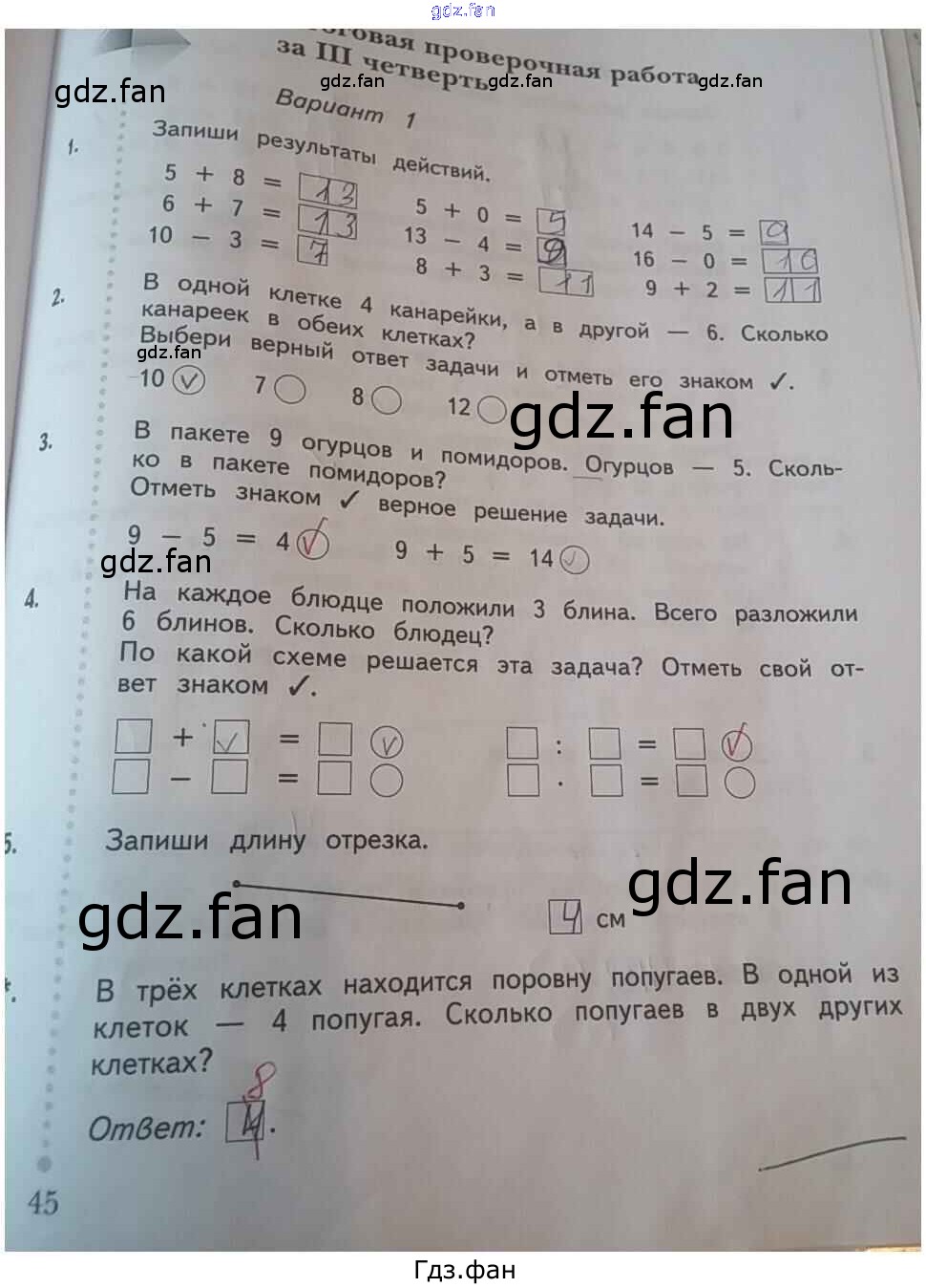 Проверка домашнего задания всегда занимает большое количество времени. На помощь приходит ГДЗ фан по Математике первого класса. Здесь собраны популярные ответы на 45 (Итоговая работа за 3 четверть. Вариант 1 № 1, 2, 3, 4, 5, 6) Математика 1 класс тетрадь для проверочных работ Рудницкая В.Н.