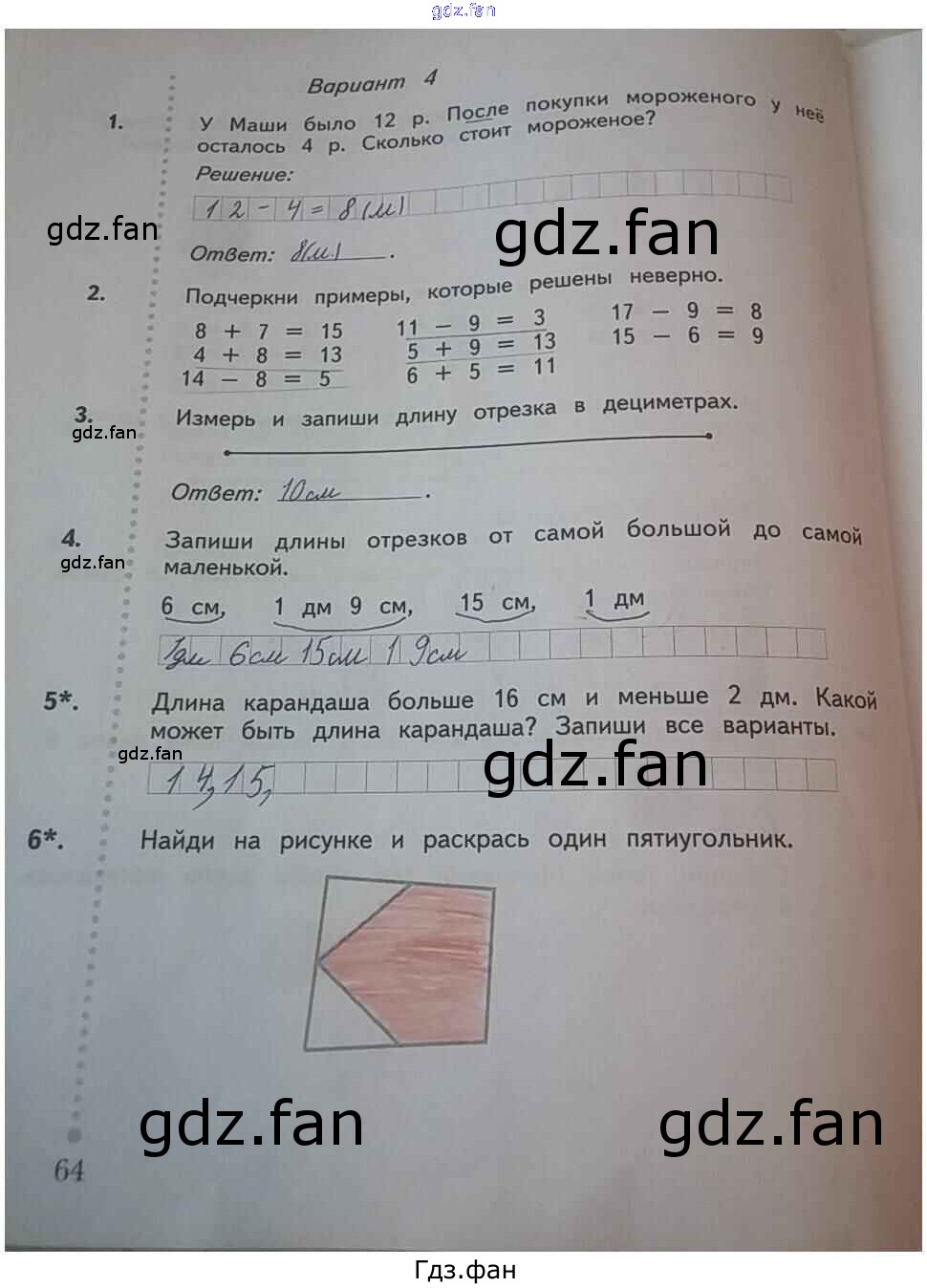 Проверка домашнего задания всегда занимает большое количество времени. На помощь приходит ГДЗ фан по Математике первого класса. Здесь собраны популярные ответы на 64 (Вариант 4 № 1, 2, 3, 4, 5, 6) Математика 1 класс тетрадь для проверочных работ Рудницкая В.Н.