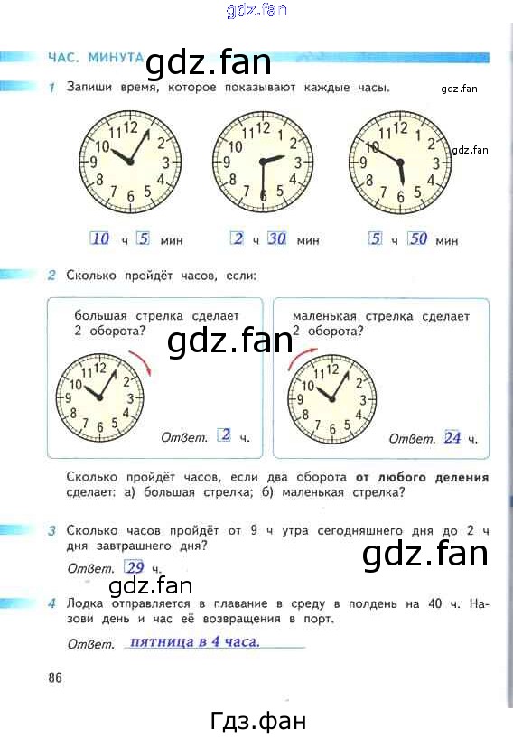 Проверка домашнего задания всегда занимает большое количество времени. На помощь приходит ГДЗ фан по Математике второго класса. Здесь собраны популярные ответы на 86 (Час. Минута № 1, 2, 3, 4) Математика 2 класс рабочая тетрадь Дорофеев Г.В.