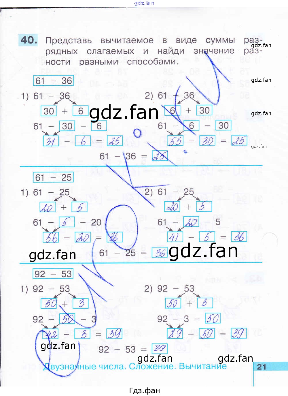 Проверка домашнего задания всегда занимает большое количество времени. На помощь приходит ГДЗ фан по Математике второго класса. Здесь собраны популярные ответы на 21 (№ 40) Математика 2 класс рабочая тетрадь Истомина Н.Б.