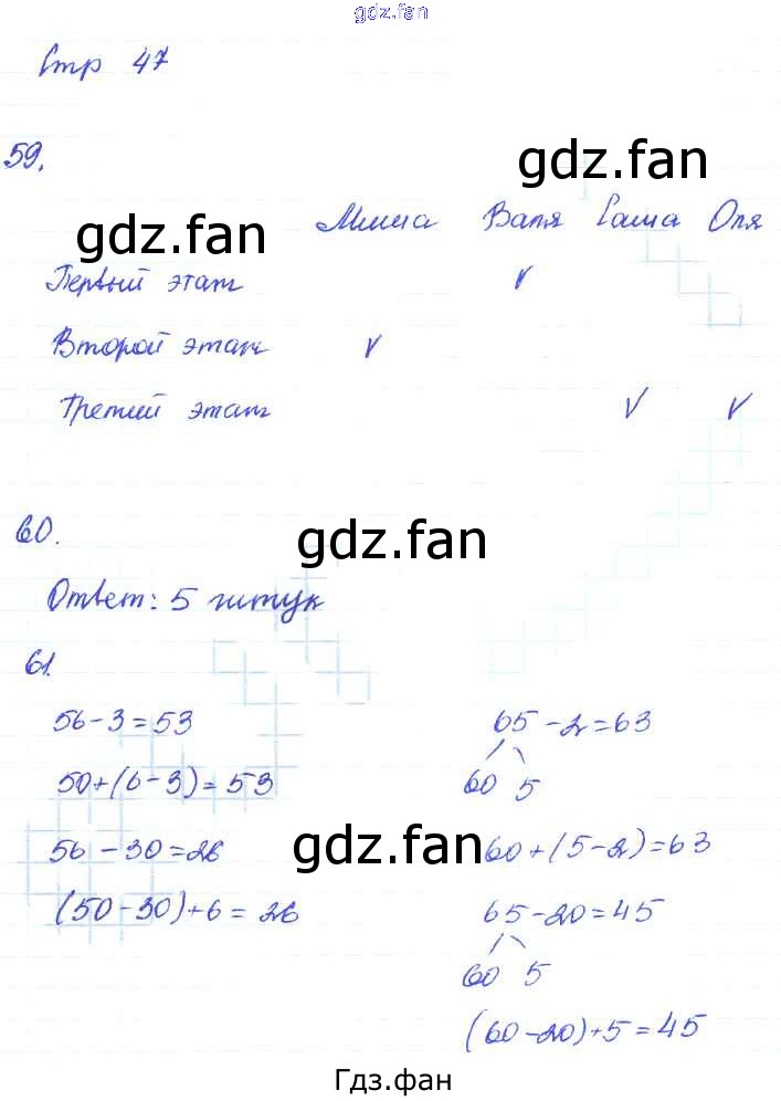Проверка домашнего задания всегда занимает большое количество времени. На помощь приходит ГДЗ фан по Математике второго класса. Здесь собраны популярные ответы на 47 (задание 59, 60, 61) Математика 2 класс рабочая тетрадь Кремнева С.Ю.