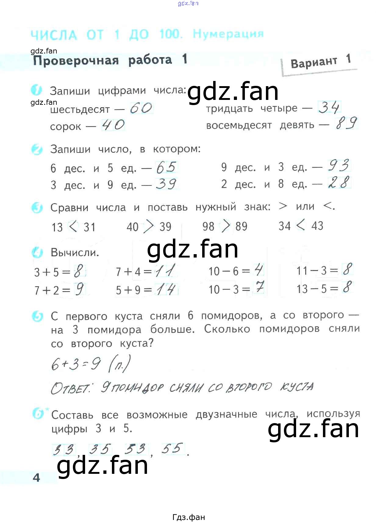Проверка домашнего задания всегда занимает большое количество времени. На помощь приходит ГДЗ фан по Математике второго класса. Здесь собраны популярные ответы на 4 (Числа от 1 до 100. Нумерация. Проверочная работа 1. Вариант 1 № 1, 2, 3, 4, 5, 6) Математика 2 класс проверочные работы Волкова С.И.