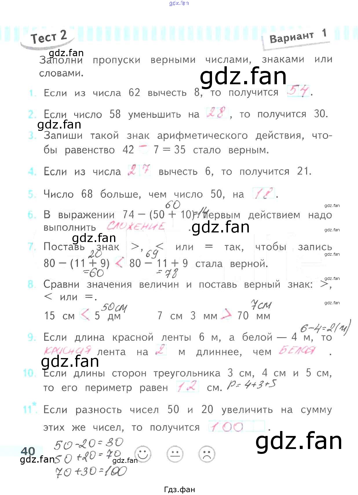 Проверка домашнего задания всегда занимает большое количество времени. На помощь приходит ГДЗ фан по Математике второго класса. Здесь собраны популярные ответы на 40 (Тест 1. Вариант 1 № 1, 2, 3, 4, 5, 6, 7, 8, 9, 10, 11) Математика 2 класс проверочные работы Волкова С.И.