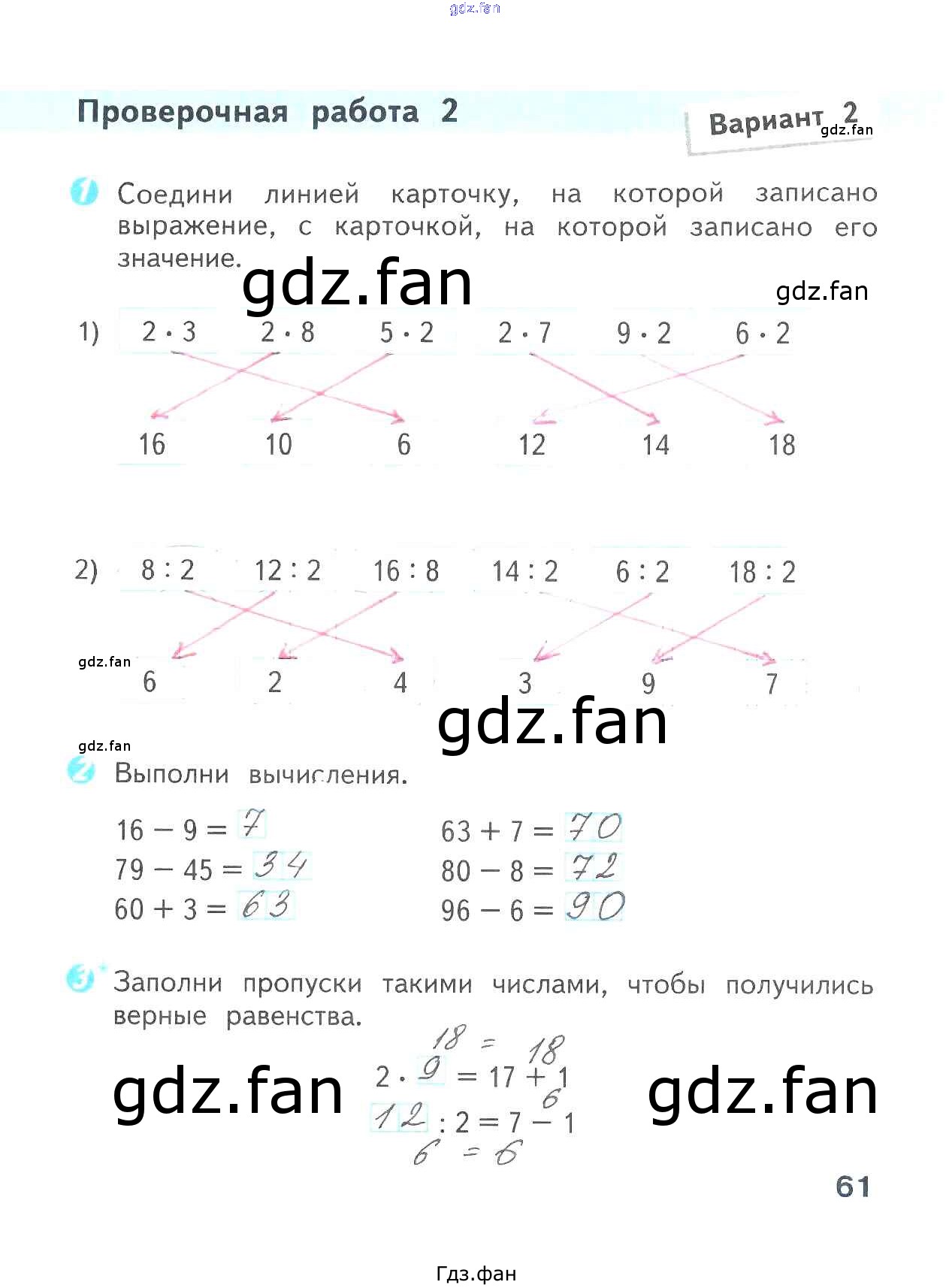 Проверка домашнего задания всегда занимает большое количество времени. На помощь приходит ГДЗ фан по Математике второго класса. Здесь собраны популярные ответы на 61 (Вариант 2 № 1, 2, 3) Математика 2 класс проверочные работы Волкова С.И.