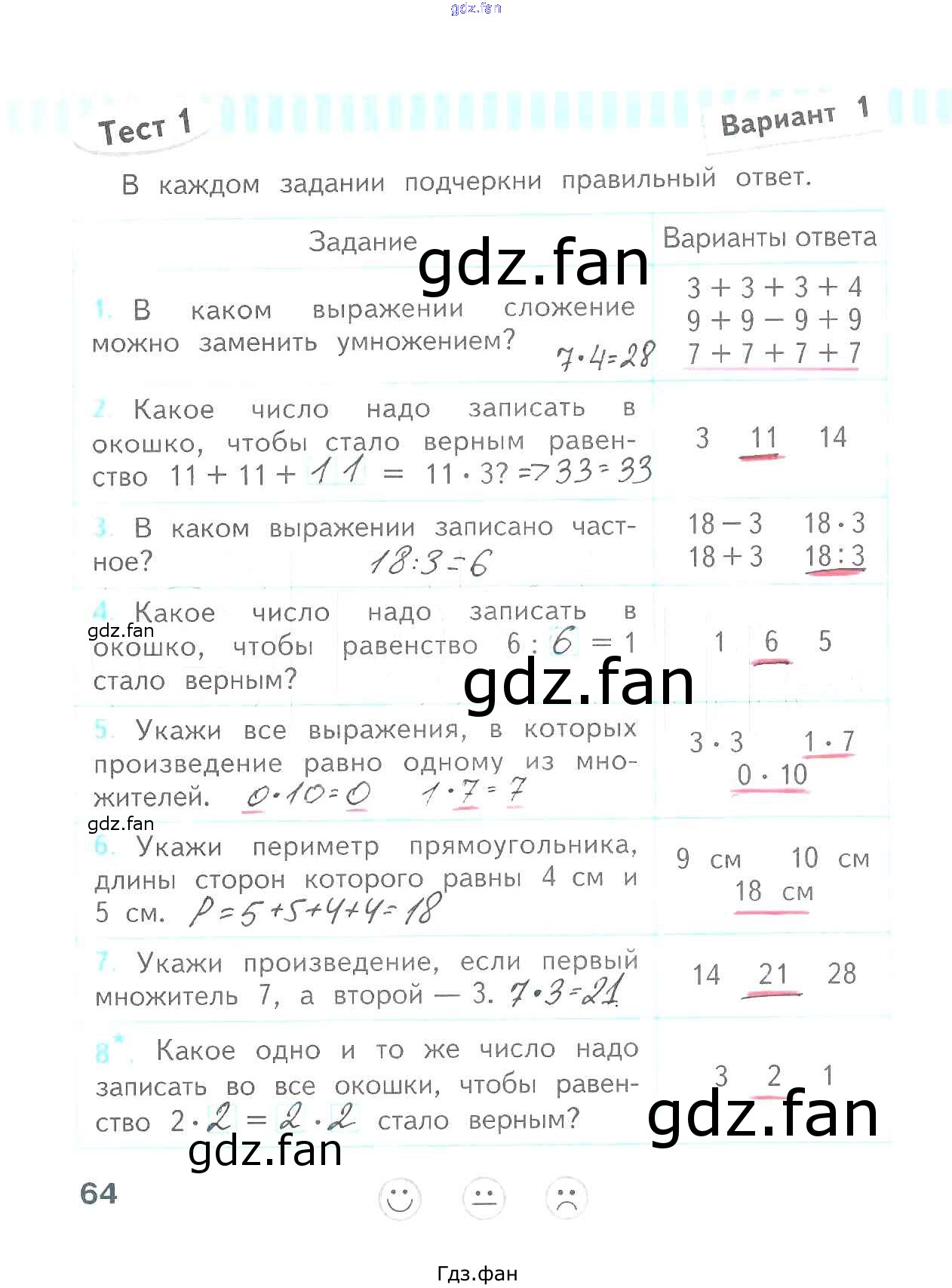 Проверка домашнего задания всегда занимает большое количество времени. На помощь приходит ГДЗ фан по Математике второго класса. Здесь собраны популярные ответы на 64 (Тест 1. Вариант 1 № 1, 2, 3, 4, 5, 6, 7, 8) Математика 2 класс проверочные работы Волкова С.И.