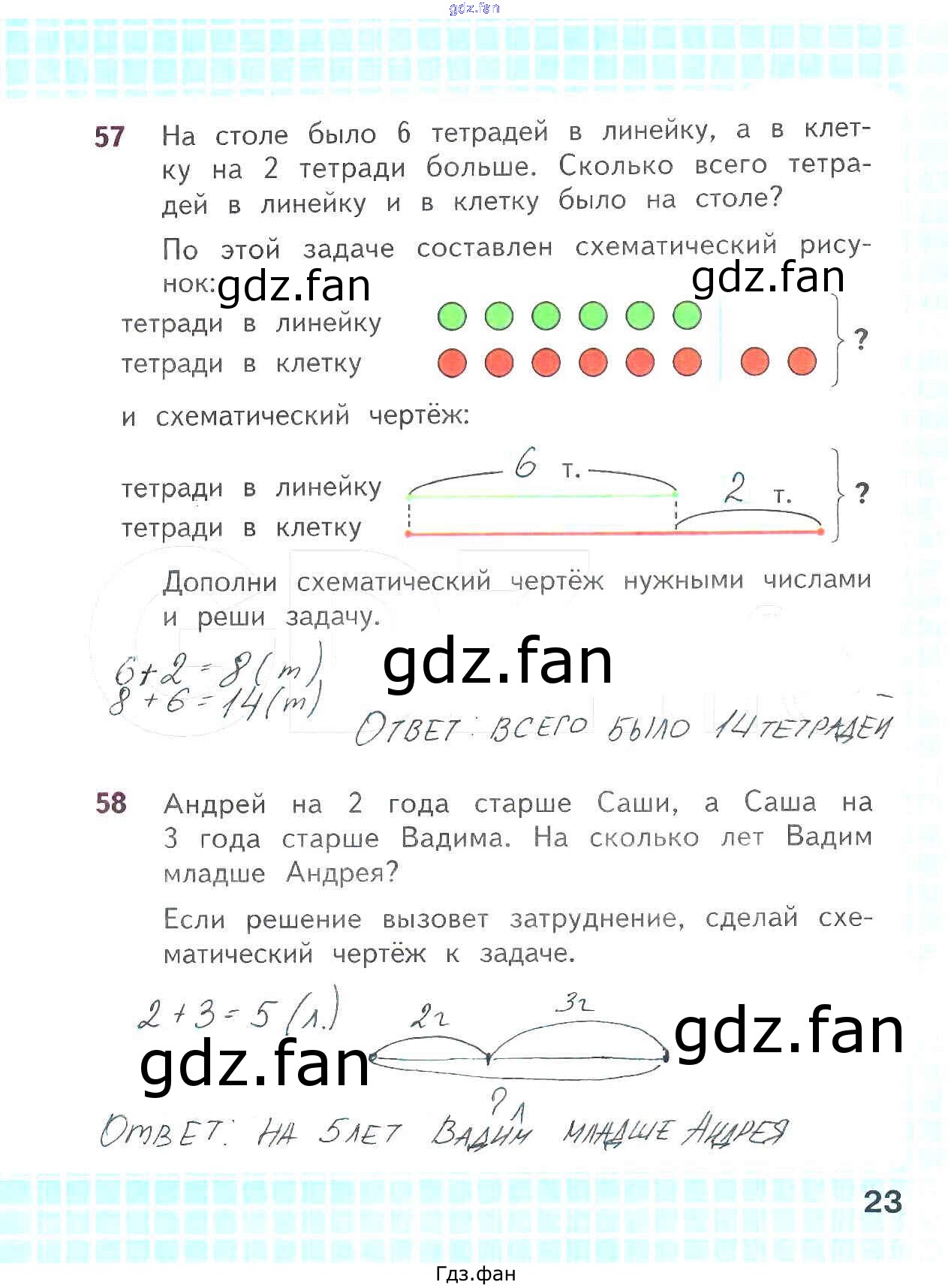 Проверка домашнего задания всегда занимает большое количество времени. На помощь приходит ГДЗ фан по Математике второго класса. Здесь собраны популярные ответы на 23 (№ 57, 58) Математика 2 класс рабочая тетрадь Волкова С.И.