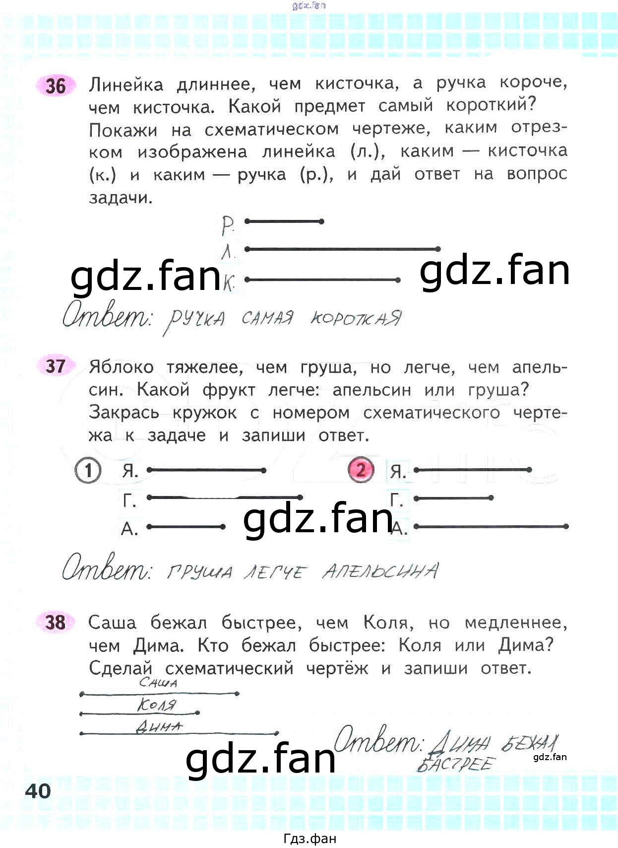 Проверка домашнего задания всегда занимает большое количество времени. На помощь приходит ГДЗ фан по Математике второго класса. Здесь собраны популярные ответы на 40 (№ 36, 37, 38) Математика 2 класс рабочая тетрадь Волкова С.И.