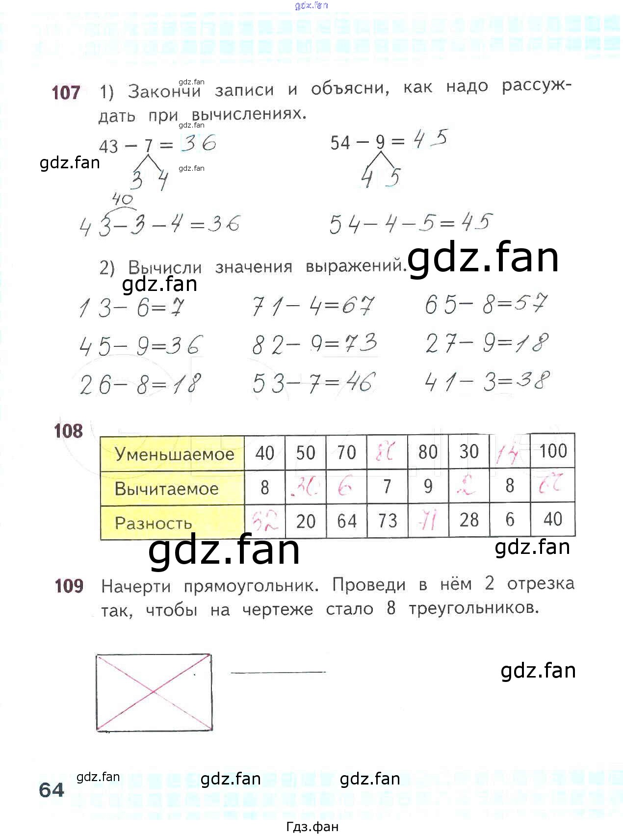 Проверка домашнего задания всегда занимает большое количество времени. На помощь приходит ГДЗ фан по Математике второго класса. Здесь собраны популярные ответы на 64 (№ 107, 108, 109) Математика 2 класс рабочая тетрадь Волкова С.И.