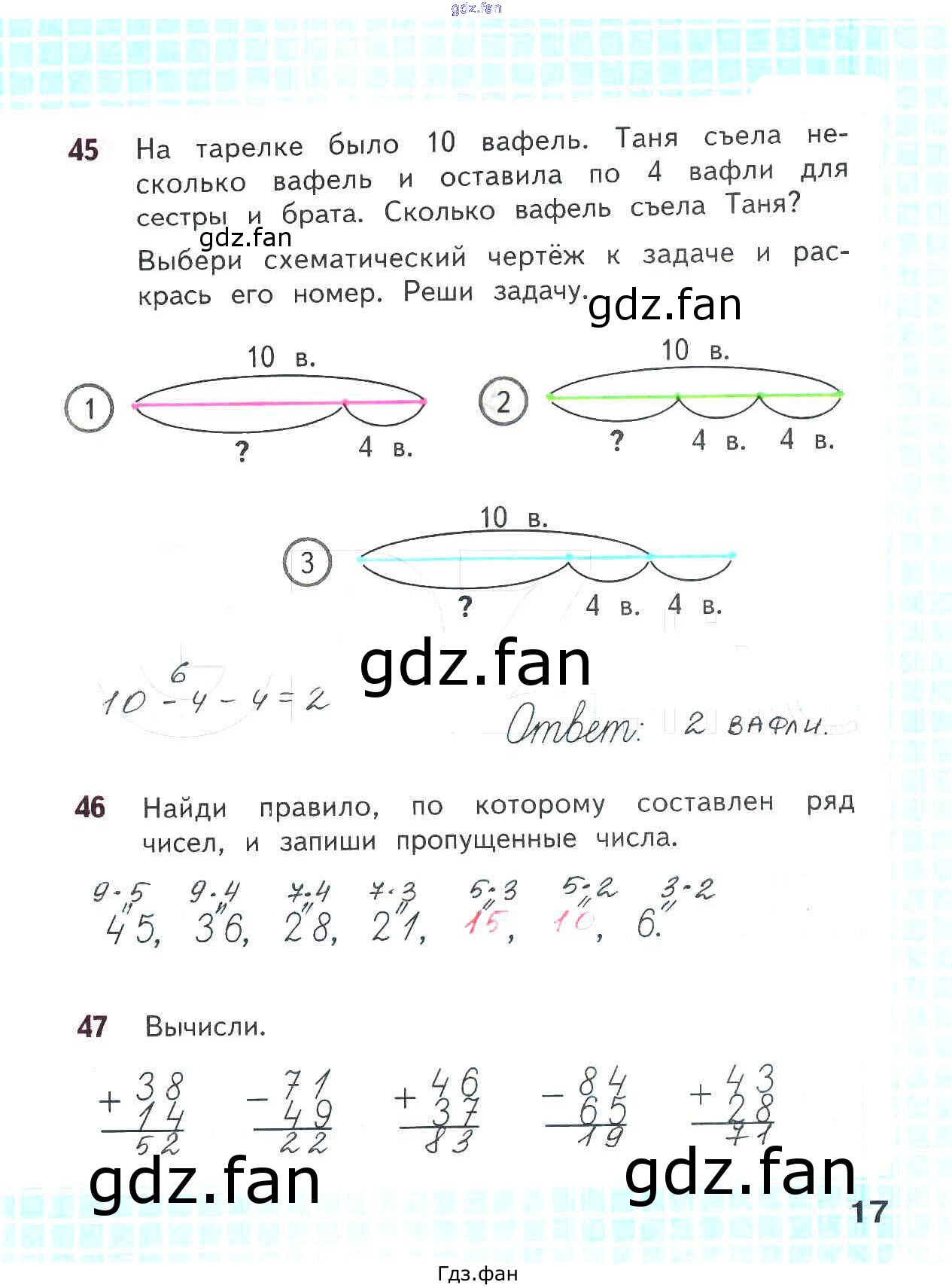 Проверка домашнего задания всегда занимает большое количество времени. На помощь приходит ГДЗ фан по Математике второго класса. Здесь собраны популярные ответы на 17 (№ 45, 46, 47) Математика 2 класс рабочая тетрадь Волкова С.И.