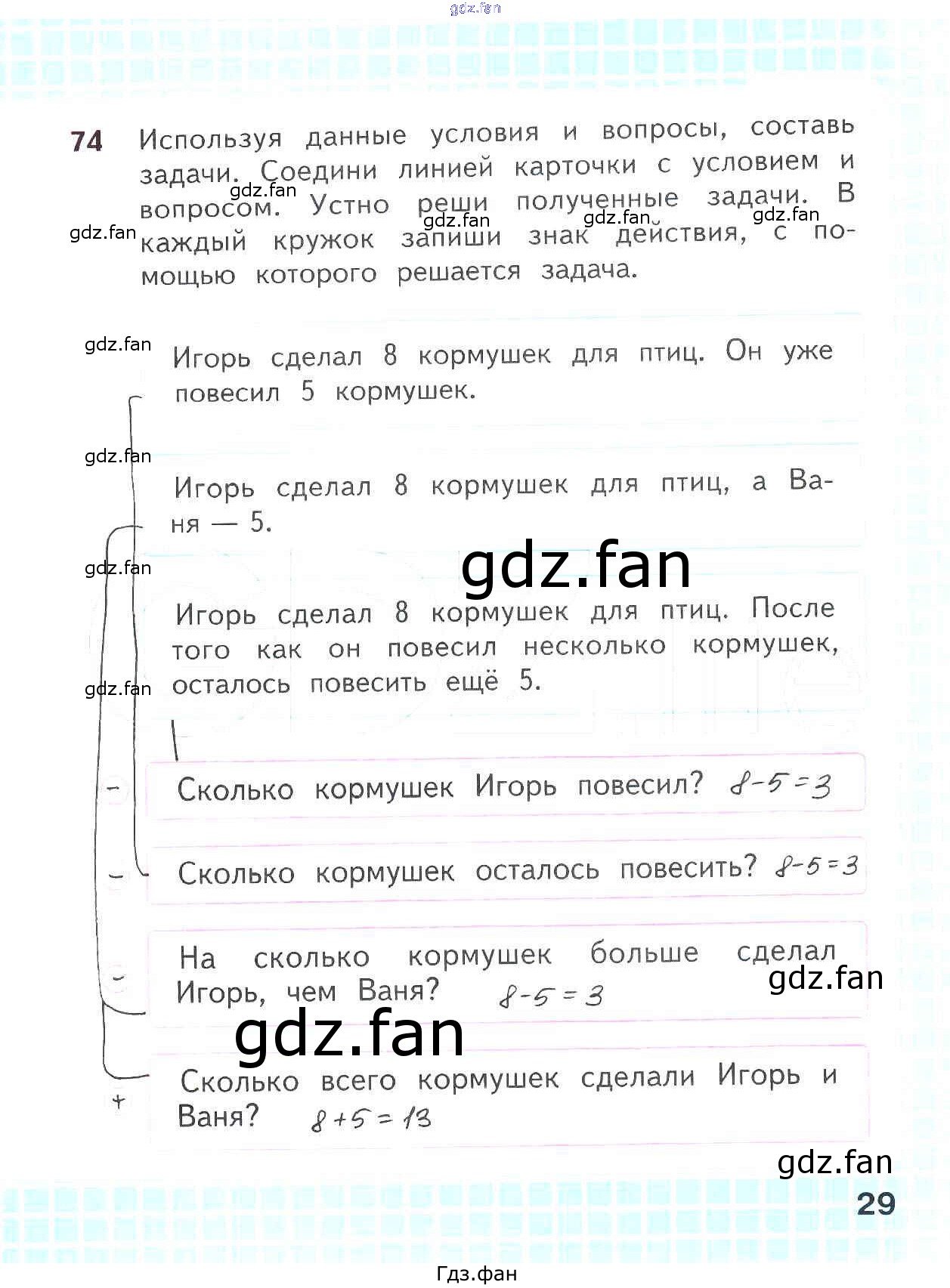 Проверка домашнего задания всегда занимает большое количество времени. На помощь приходит ГДЗ фан по Математике второго класса. Здесь собраны популярные ответы на 29 (№ 74) Математика 2 класс рабочая тетрадь Волкова С.И.