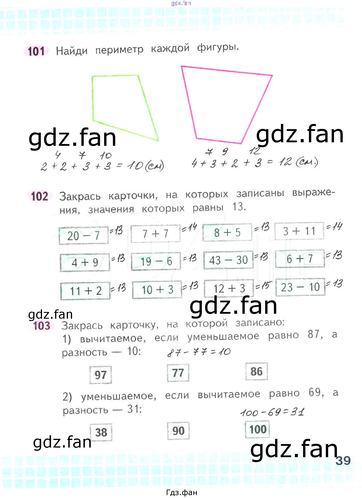 Проверка домашнего задания всегда занимает большое количество времени. На помощь приходит ГДЗ фан по Математике второго класса. Здесь собраны популярные ответы на 39 (№ 101, 102, 103) Математика 2 класс рабочая тетрадь Волкова С.И.