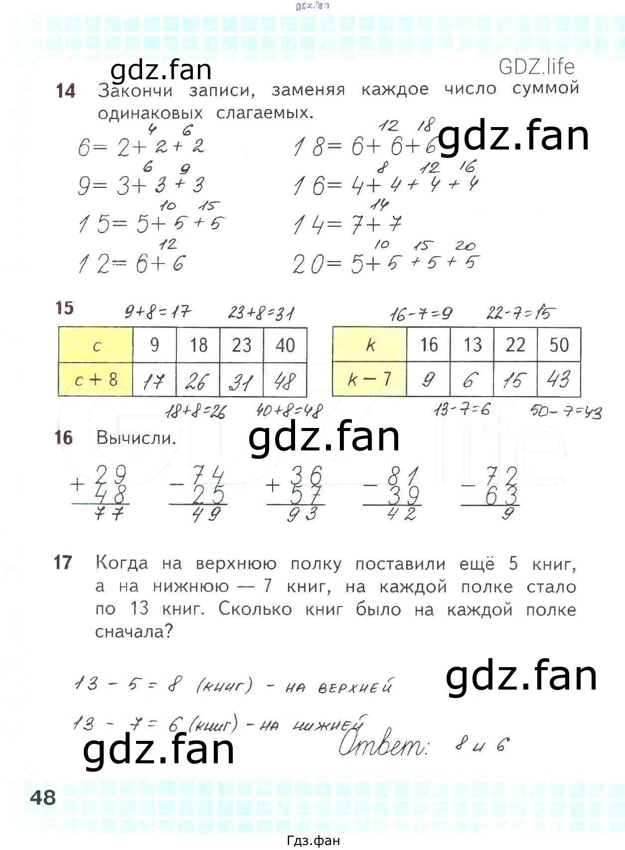 Проверка домашнего задания всегда занимает большое количество времени. На помощь приходит ГДЗ фан по Математике второго класса. Здесь собраны популярные ответы на 48 (№ 14, 15, 16, 17) Математика 2 класс рабочая тетрадь Волкова С.И.
