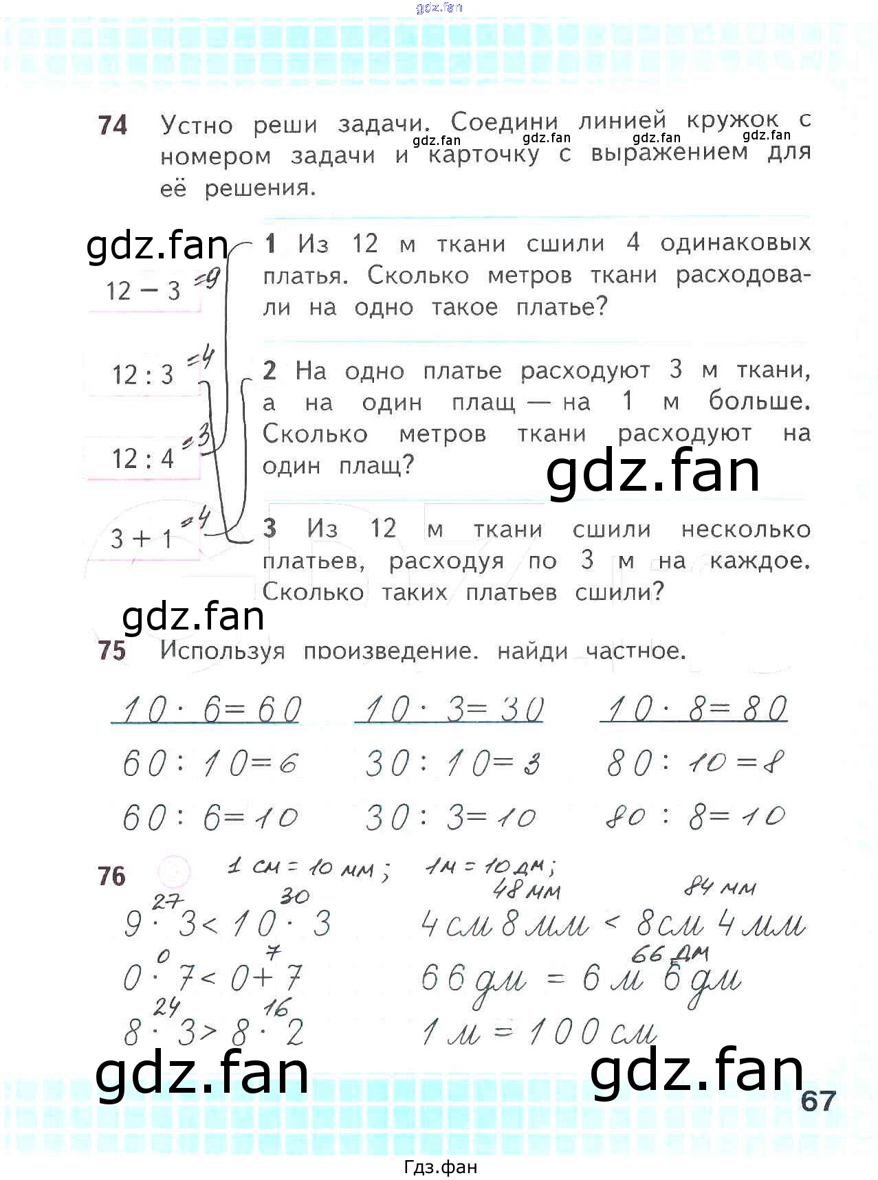 Проверка домашнего задания всегда занимает большое количество времени. На помощь приходит ГДЗ фан по Математике второго класса. Здесь собраны популярные ответы на 67 (№ 74, 75, 76) Математика 2 класс рабочая тетрадь Волкова С.И.