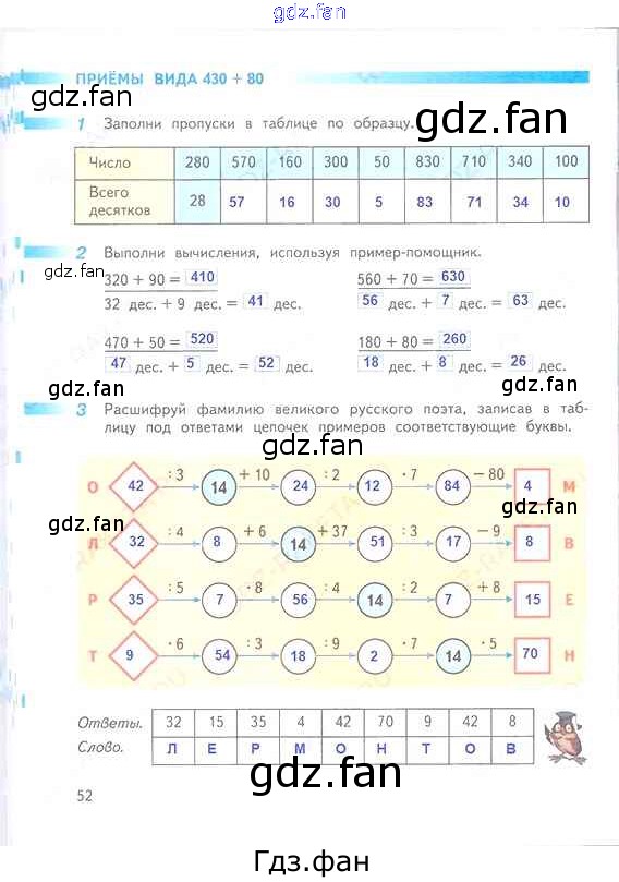 Проверка домашнего задания всегда занимает большое количество времени. На помощь приходит ГДЗ фан по Математике третьего класса. Здесь собраны популярные ответы на 52 (Приёмы вида 430 + 80 № 1, 2, 3) Математика 3 класс рабочая тетрадь Дорофеев Г.В.