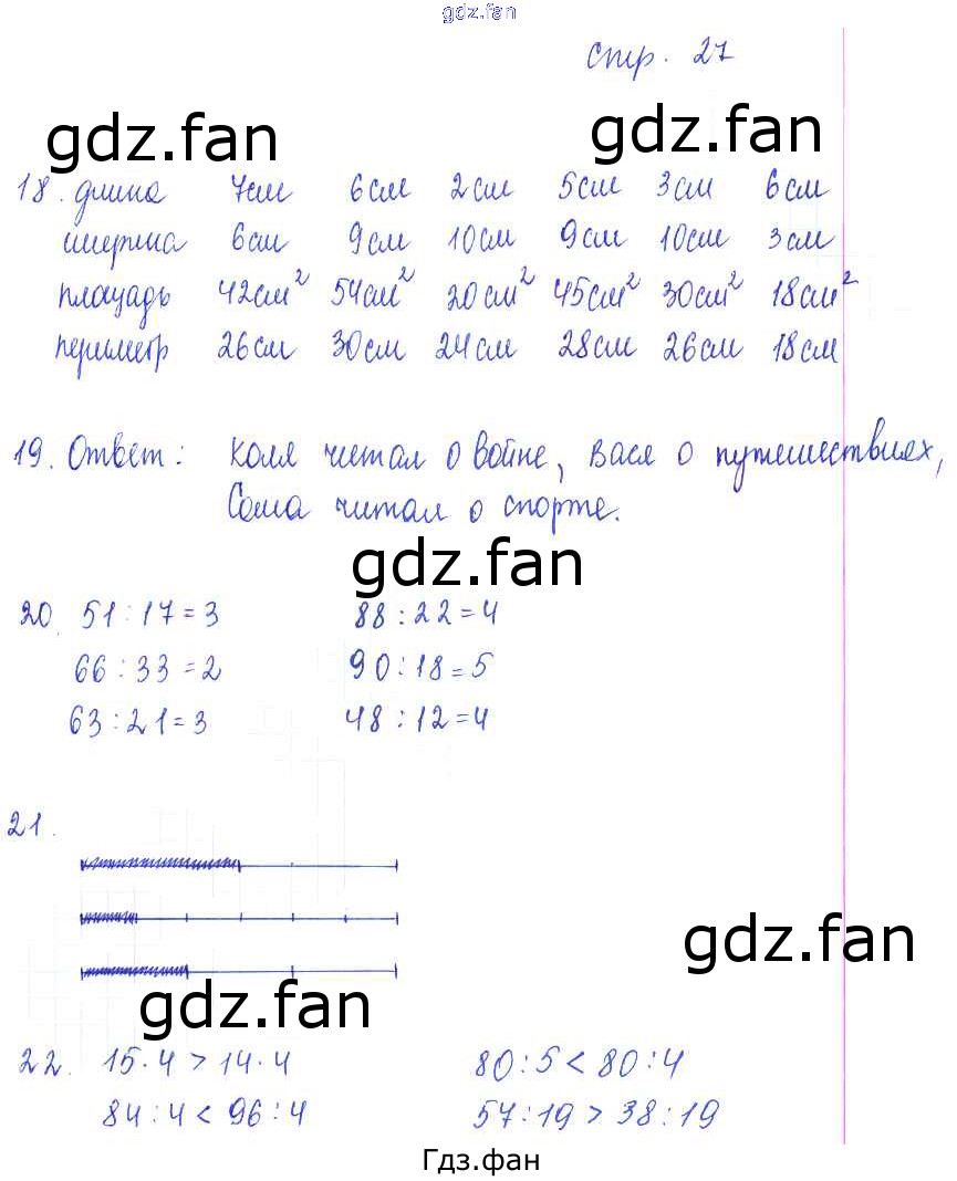 Проверка домашнего задания всегда занимает большое количество времени. На помощь приходит ГДЗ фан по Математике третьего класса. Здесь собраны популярные ответы на 27 (упражнение 18, 19, 20, 21, 22) Математика 3 класс рабочая тетрадь Кремнева С.Ю.