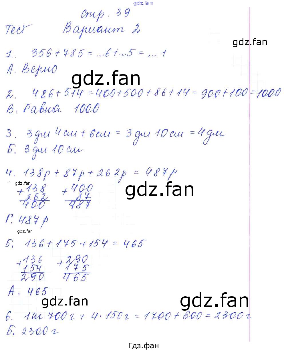 Проверка домашнего задания всегда занимает большое количество времени. На помощь приходит ГДЗ фан по Математике третьего класса. Здесь собраны популярные ответы на 39 (тест "сложение с переходом через разряд". вариант 2) Математика 3 класс тесты и самостоятельные работы Нефёдова М.Г.