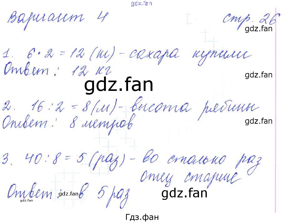 Проверка домашнего задания всегда занимает большое количество времени. На помощь приходит ГДЗ фан по Математике третьего класса. Здесь собраны популярные ответы на 26 (Вариант 4 № 1, 2, 3) Математика 3 класс: контрольные работы Рудницкая В.Н. (к уч. Моро М.И.)