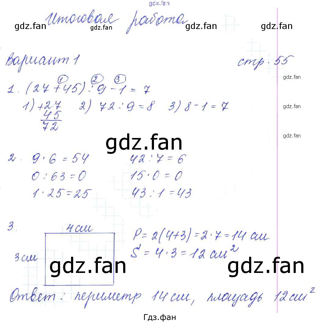 Проверка домашнего задания всегда занимает большое количество времени. На помощь приходит ГДЗ фан по Математике третьего класса. Здесь собраны популярные ответы на 55 (Итоговая работа. Вариант 1 № 1, 2, 3) Математика 3 класс: контрольные работы Рудницкая В.Н. (к уч. Моро М.И.)