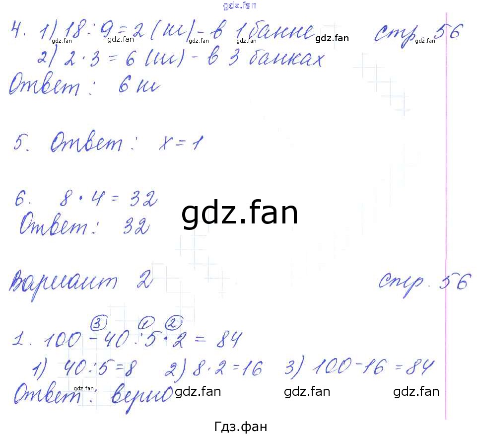 Проверка домашнего задания всегда занимает большое количество времени. На помощь приходит ГДЗ фан по Математике третьего класса. Здесь собраны популярные ответы на 56 (№ 4, 5, 6. Вариант 2 № 1) Математика 3 класс: контрольные работы Рудницкая В.Н. (к уч. Моро М.И.)