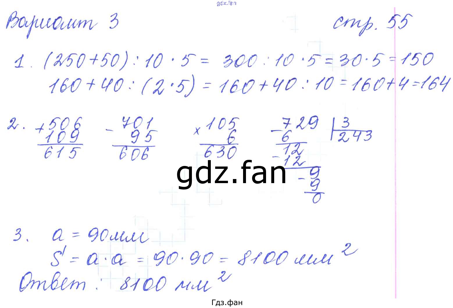 Проверка домашнего задания всегда занимает большое количество времени. На помощь приходит ГДЗ фан по Математике третьего класса. Здесь собраны популярные ответы на 55 (Вариант 3 № 1, 2, 3) Математика 3 класс: контрольные работы Рудницкая В.Н. (к уч. Моро М.И.)