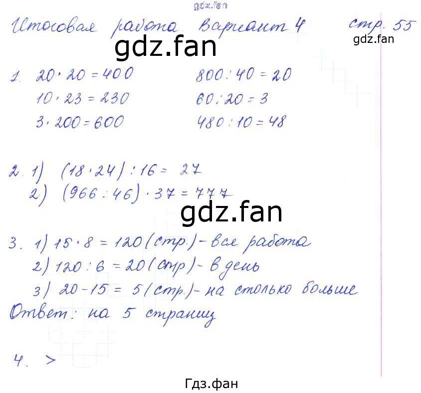 Проверка домашнего задания всегда занимает большое количество времени. На помощь приходит ГДЗ фан по Математике третьего класса. Здесь собраны популярные ответы на 55 (итоговая работа, четверть 4 вариант 4) Математика 3 класс тетрадь для контрольных работ Рудницкая В.Н.
