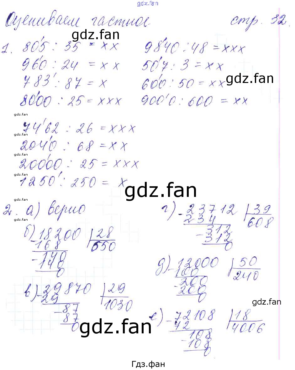 Проверка домашнего задания всегда занимает большое количество времени. На помощь приходит ГДЗ фан по Математике четвертого класса. Здесь собраны популярные ответы на 32 (Оцениваем частное № 1, 2) Математика 4 класс рабочая тетрадь Башмаков М.И.