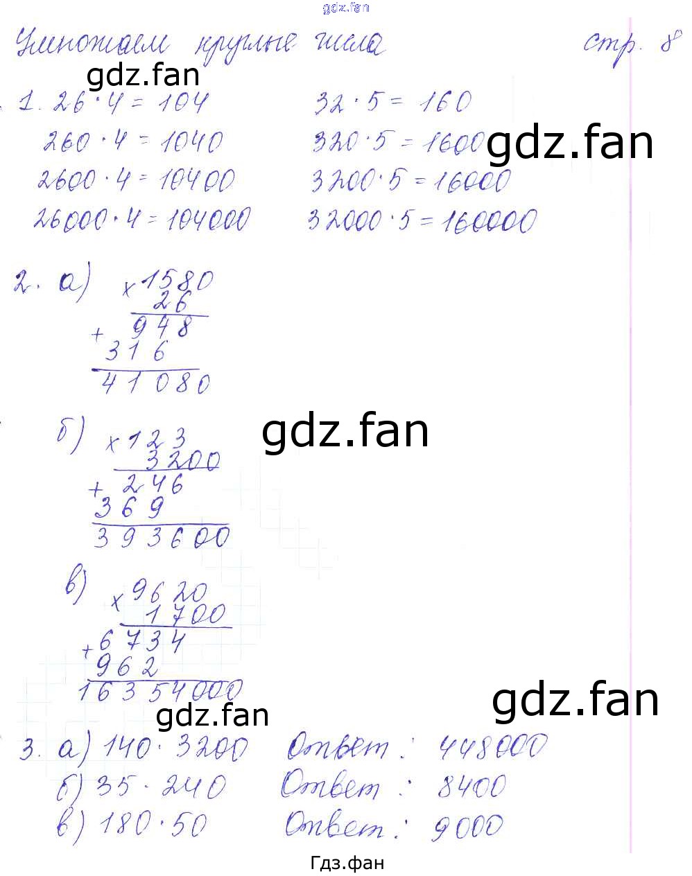 Проверка домашнего задания всегда занимает большое количество времени. На помощь приходит ГДЗ фан по Математике четвертого класса. Здесь собраны популярные ответы на 8 (Умножаем круглые числа № 1, 2, 3) Математика 4 класс рабочая тетрадь Башмаков М.И.