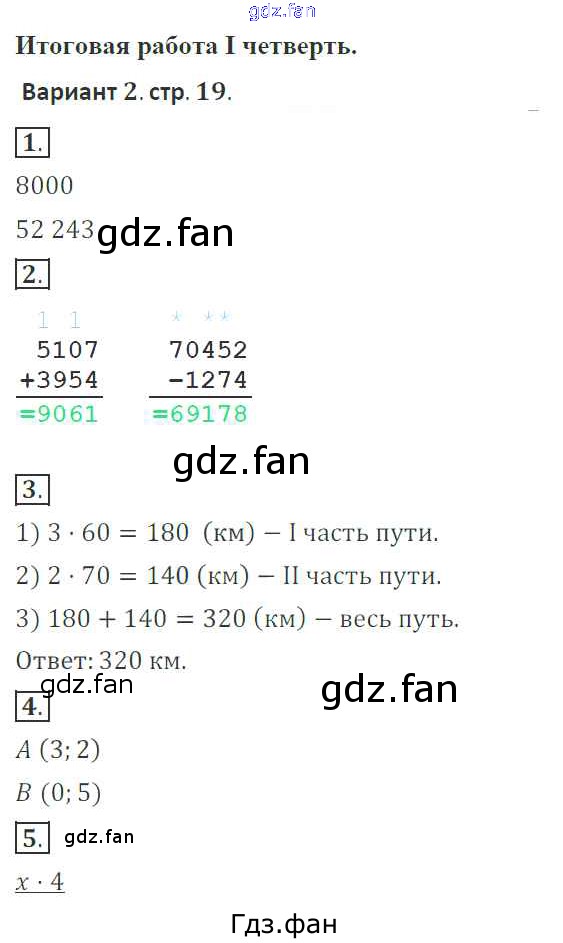Проверка домашнего задания всегда занимает большое количество времени. На помощь приходит ГДЗ фан по Математике четвертого класса. Здесь собраны популярные ответы на 19 (Вариант 2 № 1, 2, 3, 4, 5) Математика 4 класс тетрадь для контрольных работ Рудницкая В.Н.
