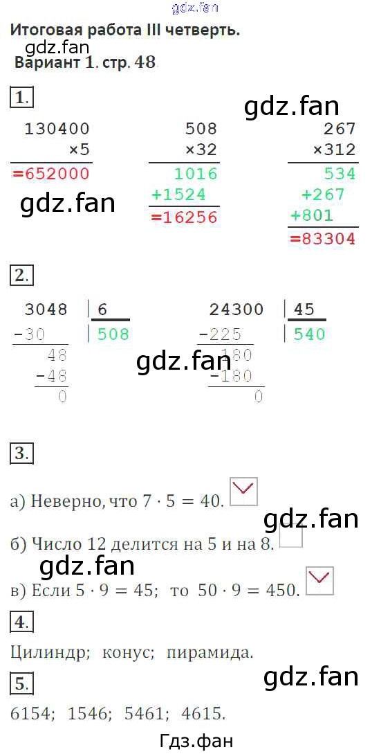 Проверка домашнего задания всегда занимает большое количество времени. На помощь приходит ГДЗ фан по Математике четвертого класса. Здесь собраны популярные ответы на 48 (Итоговая работа 3 четверть. Вариант 1 № 1, 2, 3, 4, 5) Математика 4 класс тетрадь для контрольных работ Рудницкая В.Н.