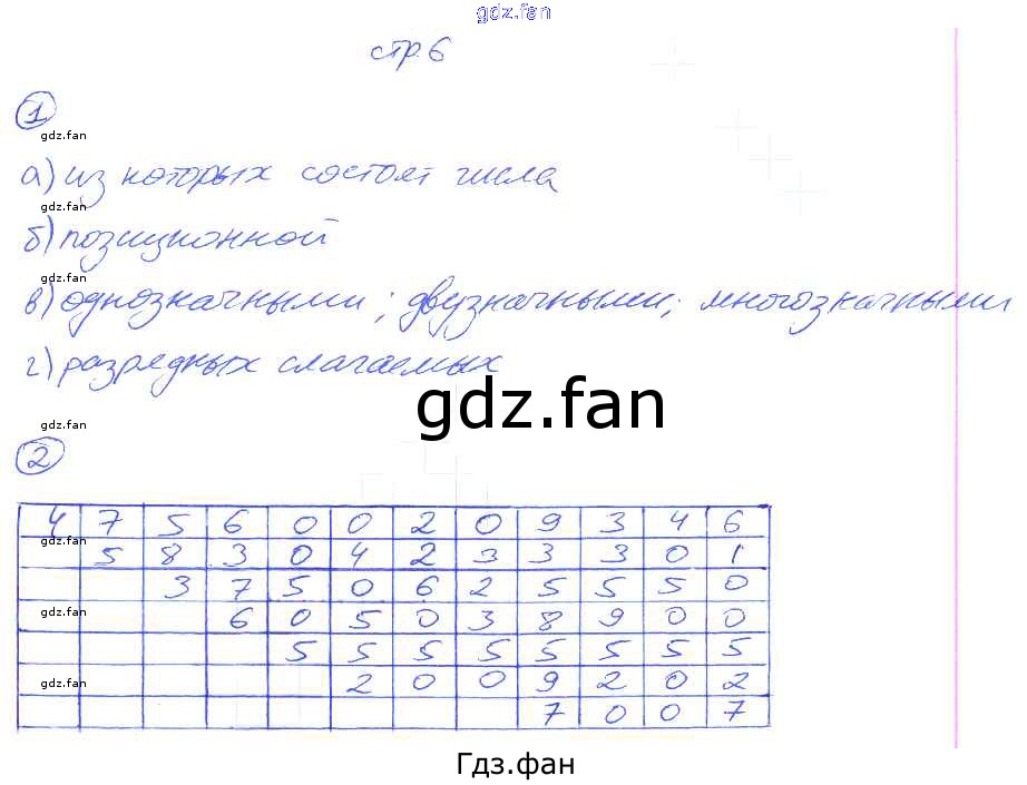 Проверка домашнего задания всегда занимает большое количество времени. На помощь приходит ГДЗ фан по Математике пятого класса. Здесь собраны популярные ответы на 6 (§1.2. Десятичная система записи натуральных чисел № 1, 2) Математика 5 класс рабочая тетрадь Ерина Т.М. (к новому уч. Никольского С.М.)