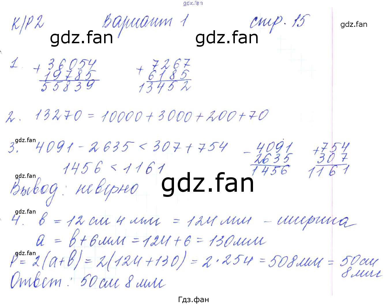 Проверка домашнего задания всегда занимает большое количество времени. На помощь приходит ГДЗ фан по Математике пятого класса. Здесь собраны популярные ответы на 15 (КР-2. Сложение и вычитание натуральных чисел. Вариант 1 № 1, 2, 3, 4) Математика 5 класс рабочая тетрадь для контрольных работ Рудницкая В.Н. (к уч. Виленкина Н.Я.)