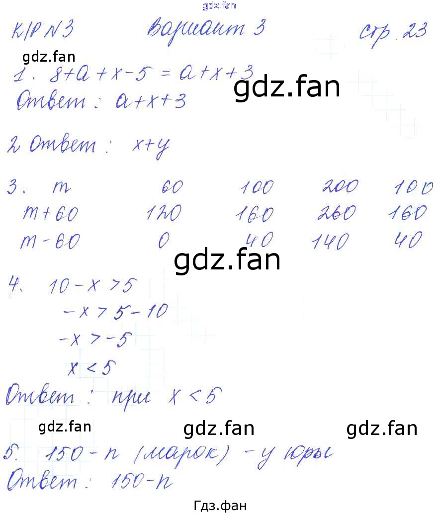 Проверка домашнего задания всегда занимает большое количество времени. На помощь приходит ГДЗ фан по Математике пятого класса. Здесь собраны популярные ответы на 23 (КР-3. Буквенные выражения. Уравнение. Вариант 1 № 1, 2, 3, 4, 5) Математика 5 класс рабочая тетрадь для контрольных работ Рудницкая В.Н. (к уч. Виленкина Н.Я.)