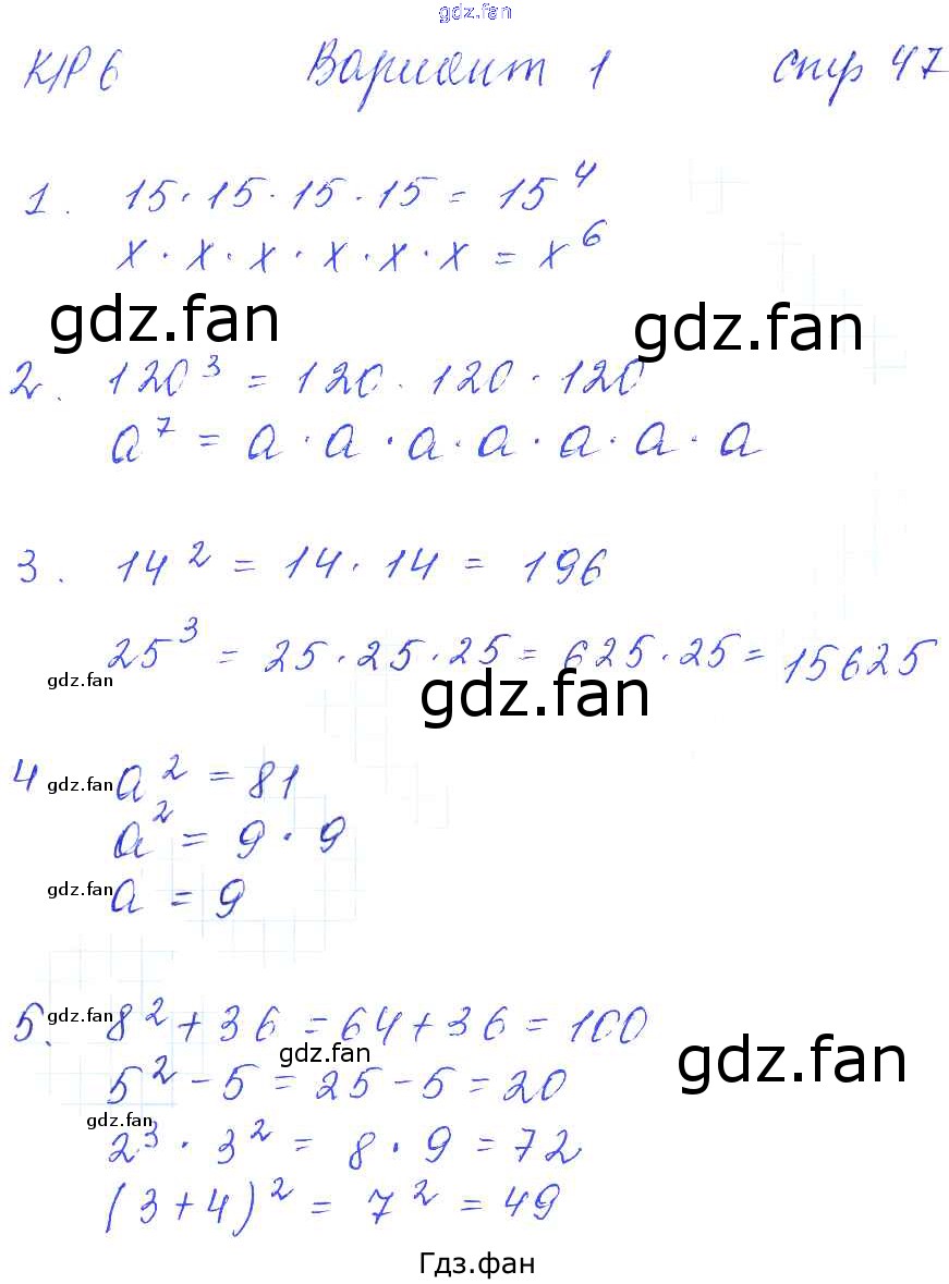Проверка домашнего задания всегда занимает большое количество времени. На помощь приходит ГДЗ фан по Математике пятого класса. Здесь собраны популярные ответы на 47 (КР-6. Степень числа. Вариант 1 № 1, 2, 3, 4, 5) Математика 5 класс рабочая тетрадь для контрольных работ Рудницкая В.Н. (к уч. Виленкина Н.Я.)