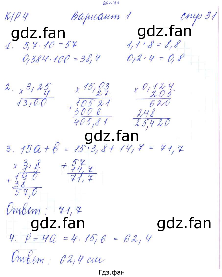 Проверка домашнего задания всегда занимает большое количество времени. На помощь приходит ГДЗ фан по Математике пятого класса. Здесь собраны популярные ответы на 31 (КР-4. Умножение и деление десятичных дробей. Вариант 1 № 1, 2, 3, 4) Математика 5 класс рабочая тетрадь для контрольных работ Рудницкая В.Н. (к уч. Виленкина Н.Я.)