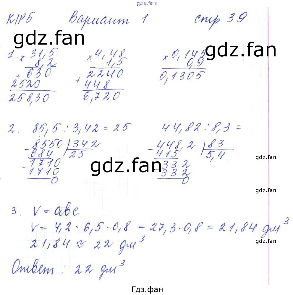 Проверка домашнего задания всегда занимает большое количество времени. На помощь приходит ГДЗ фан по Математике пятого класса. Здесь собраны популярные ответы на 39 (КР-5. Арифметические действия с десятичными дробями. Вариант 1 № 1, 2, 3) Математика 5 класс рабочая тетрадь для контрольных работ Рудницкая В.Н. (к уч. Виленкина Н.Я.)