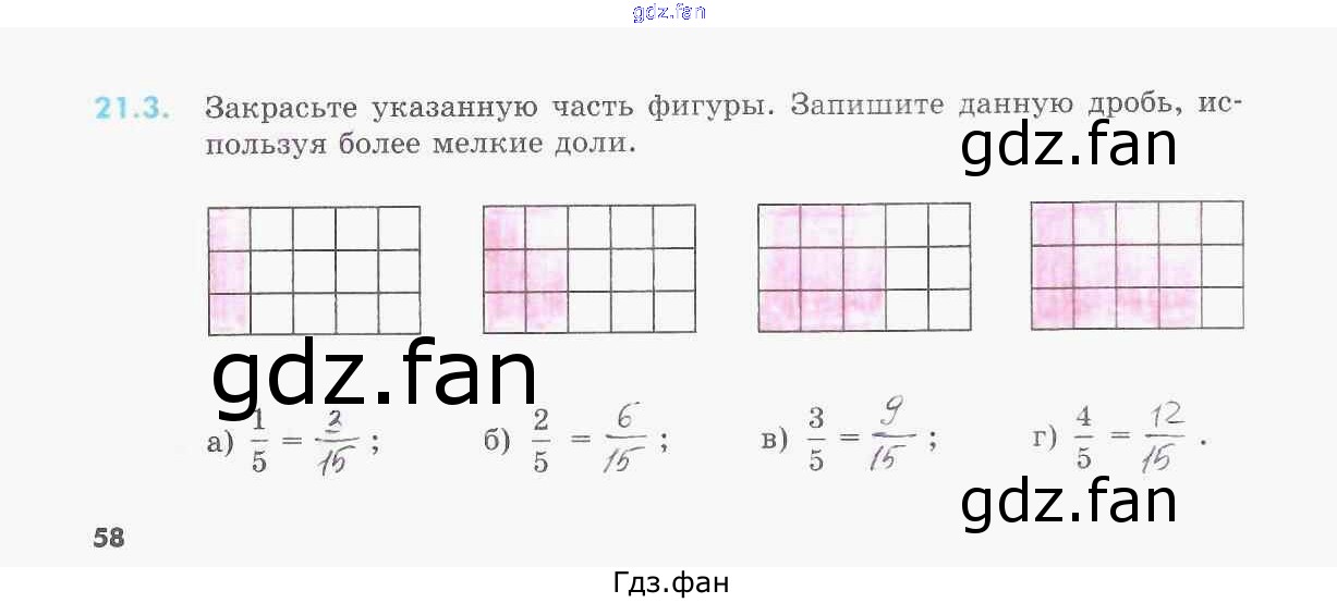 Проверка домашнего задания всегда занимает большое количество времени. На помощь приходит ГДЗ фан по Математике пятого класса. Здесь собраны популярные ответы на 21.3 (стр. 58) Математика 5 класс рабочая тетрадь Зубарева И.И.