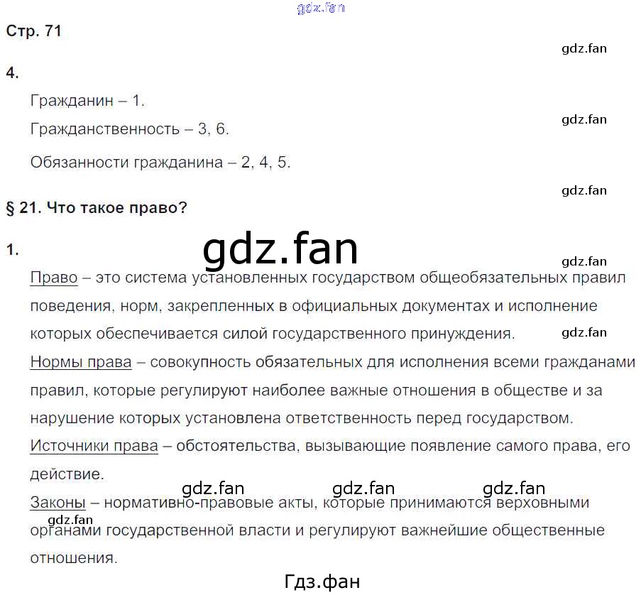 Проверка домашнего задания всегда занимает большое количество времени. На помощь приходит ГДЗ фан по Обществознанию восьмого класса. Здесь собраны популярные ответы на 71 (№ 4. §21. Что такое право? № 1) Обществознание 8 класс рабочая тетрадь Федорова С.А.