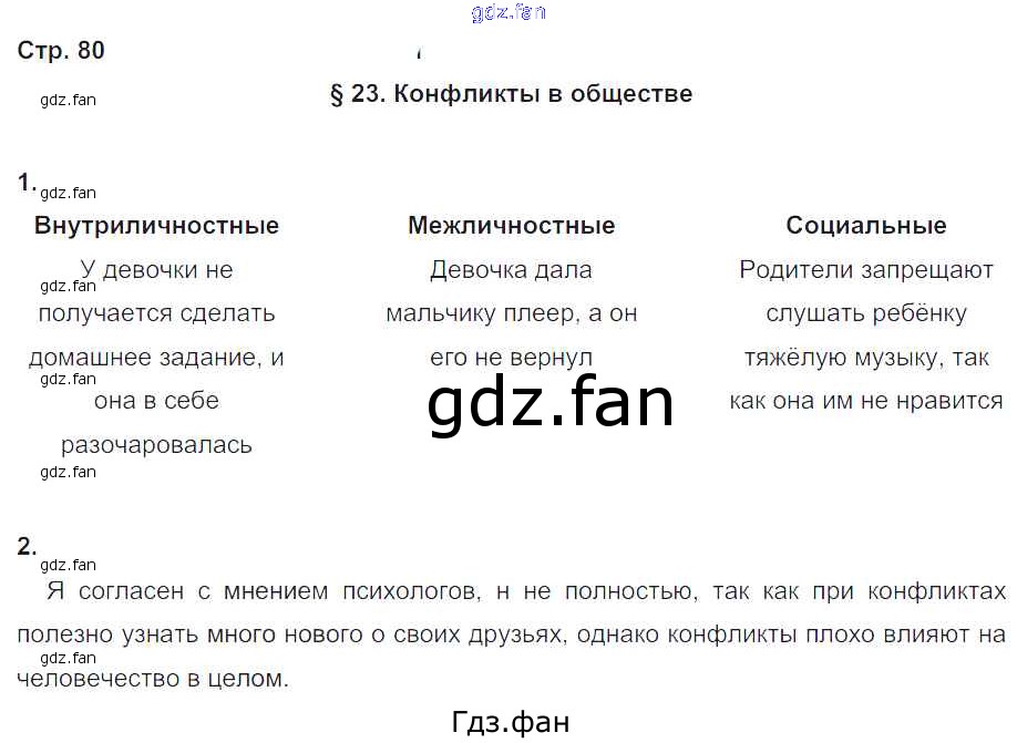 Проверка домашнего задания всегда занимает большое количество времени. На помощь приходит ГДЗ фан по Обществознанию восьмого класса. Здесь собраны популярные ответы на 80 (§23. Конфликты в обществе № 1, 2) Обществознание 8 класс рабочая тетрадь Хромова И.С. (к уч. Кравченко)