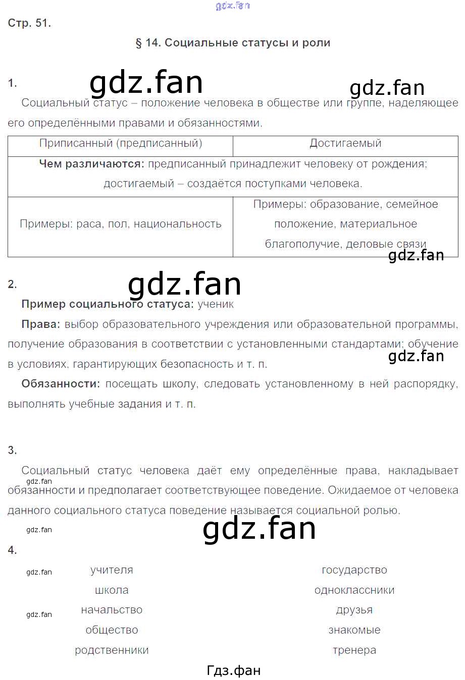 Проверка домашнего задания всегда занимает большое количество времени. На помощь приходит ГДЗ фан по Обществознанию восьмого класса. Здесь собраны популярные ответы на 51 (№ §14. Социальные статусы и роли № 1, 2, 3, 4) Обществознание 8 класс рабочая тетрадь Котова О.А.