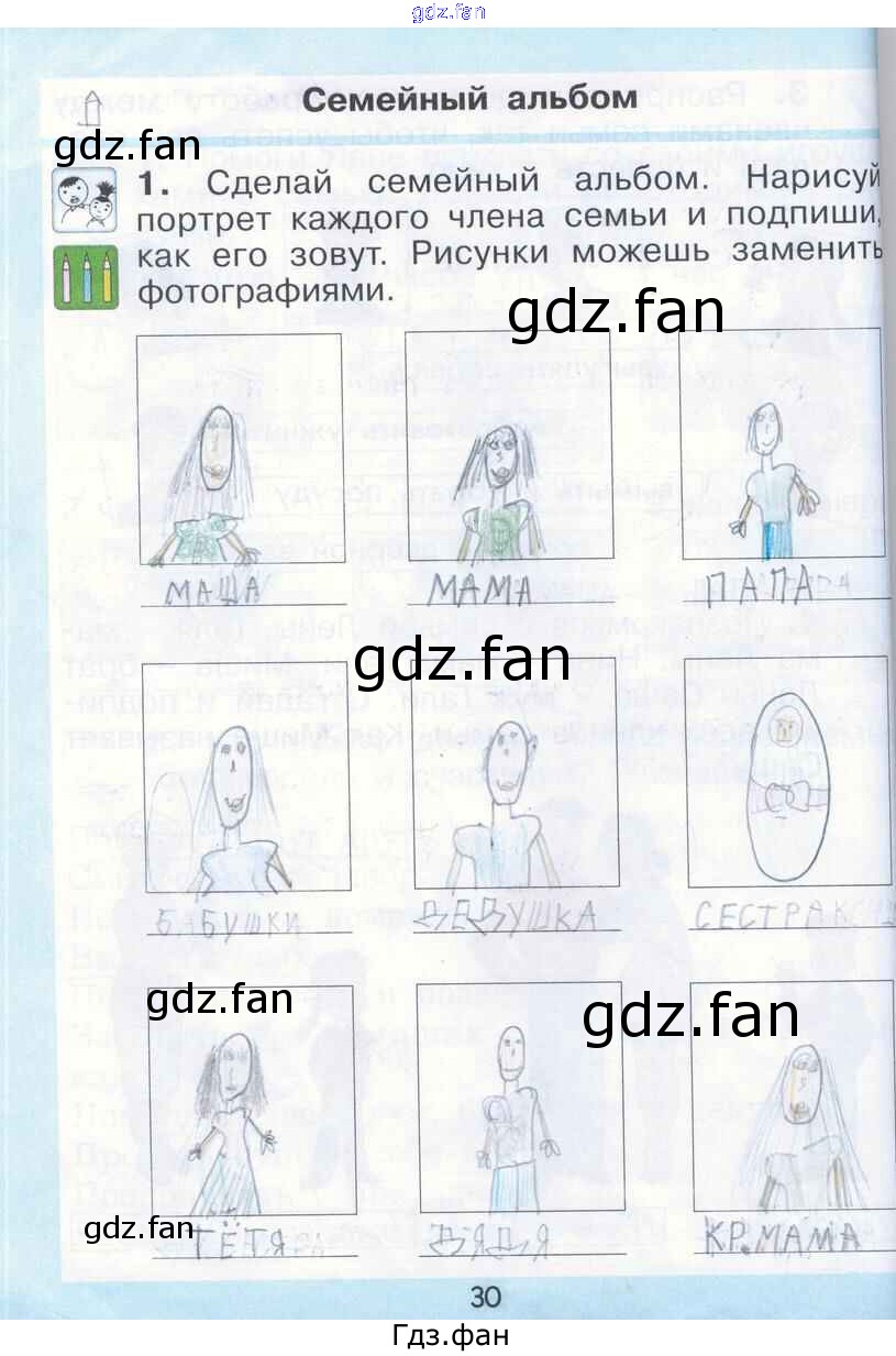 Проверка домашнего задания всегда занимает большое количество времени. На помощь приходит ГДЗ фан по Окружающему миру первого класса. Здесь собраны популярные ответы на 30 (Семейный альбом № 1) Окружающий мир 1 класс рабочая тетрадь Вахрушев А.А.