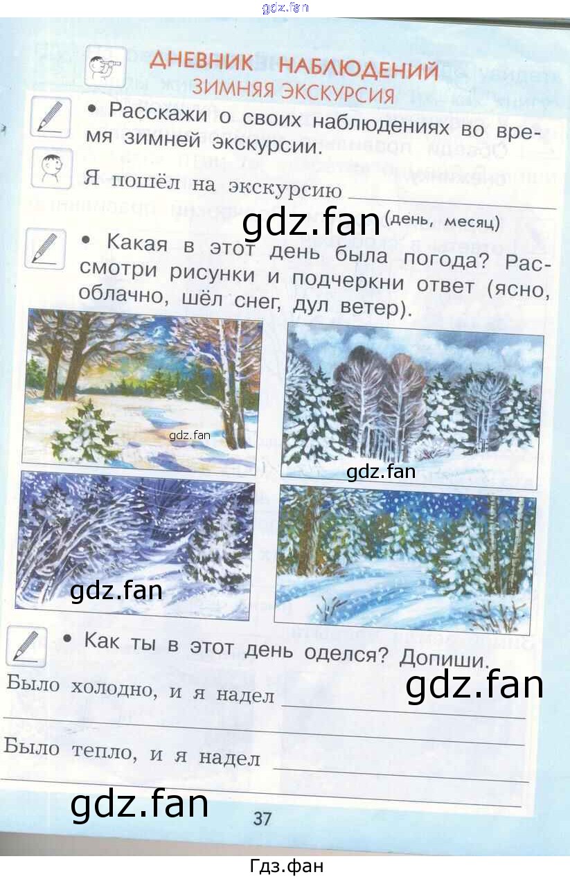 Проверка домашнего задания всегда занимает большое количество времени. На помощь приходит ГДЗ фан по Окружающему миру первого класса. Здесь собраны популярные ответы на 37 (Дневник наблюдений. Зимняя экскурсия) Окружающий мир 1 класс рабочая тетрадь Вахрушев А.А.