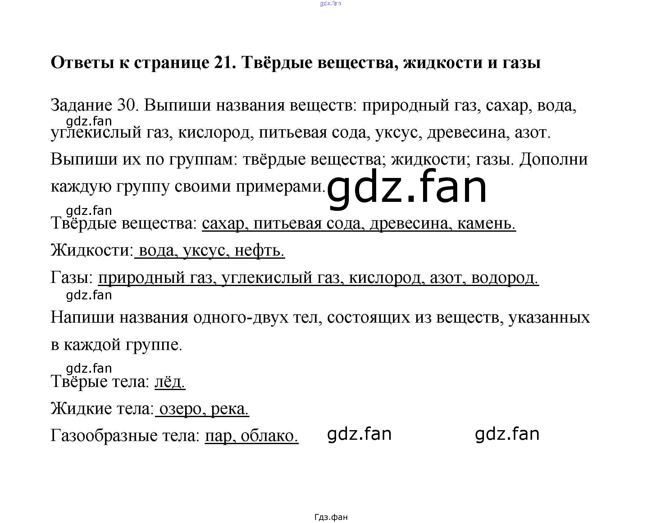 Проверка домашнего задания всегда занимает большое количество времени. На помощь приходит ГДЗ фан по Окружающему миру третьего класса. Здесь собраны популярные ответы на 21 (Твёрдые вещества, жидкости и газы № 30) Окружающий мир 3 класс тетрадь для самостоятельной работы Федотова
